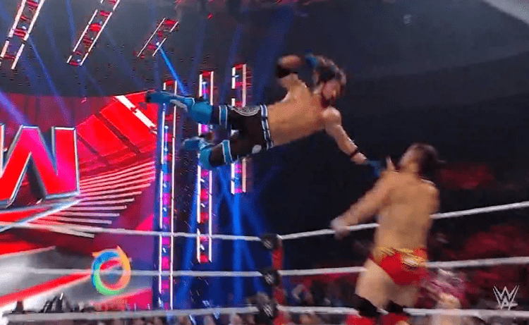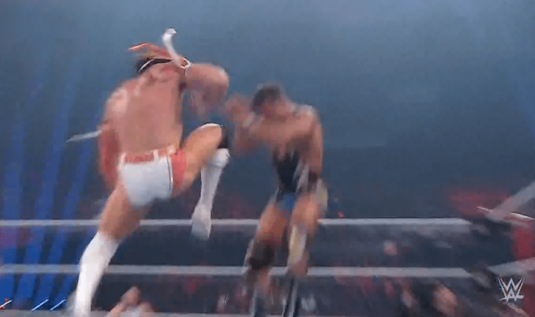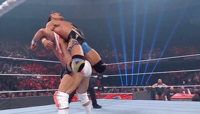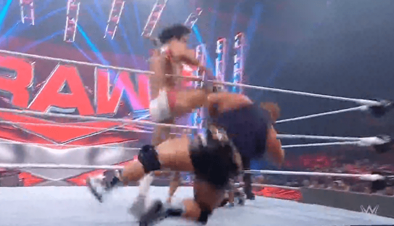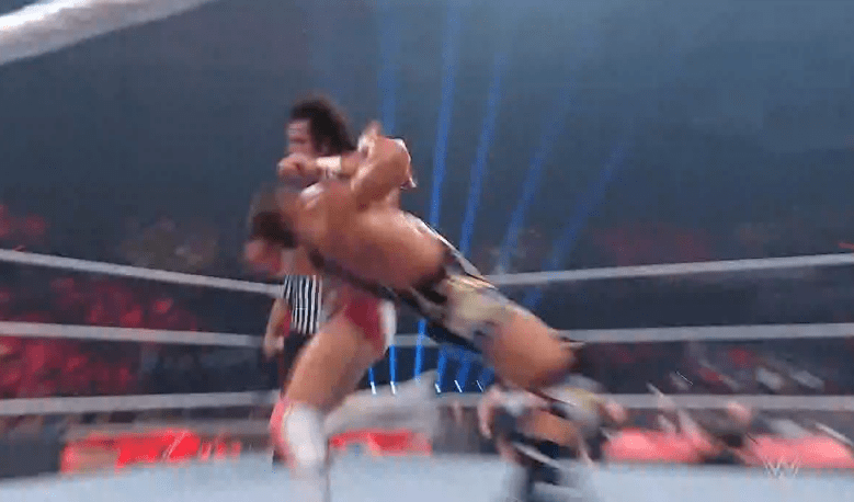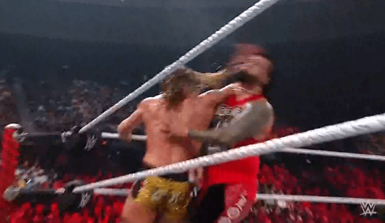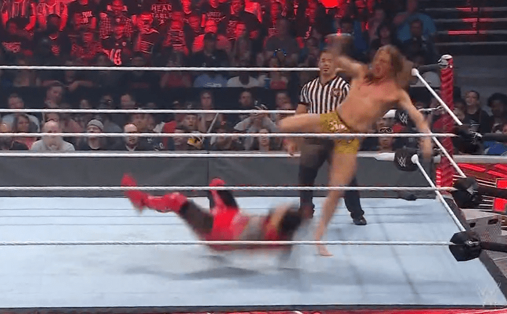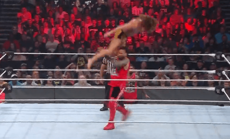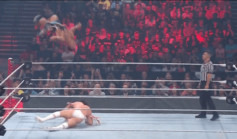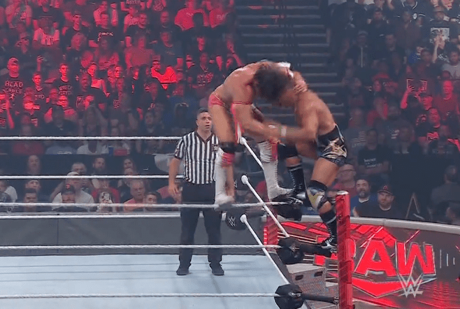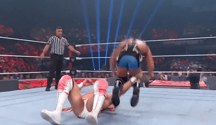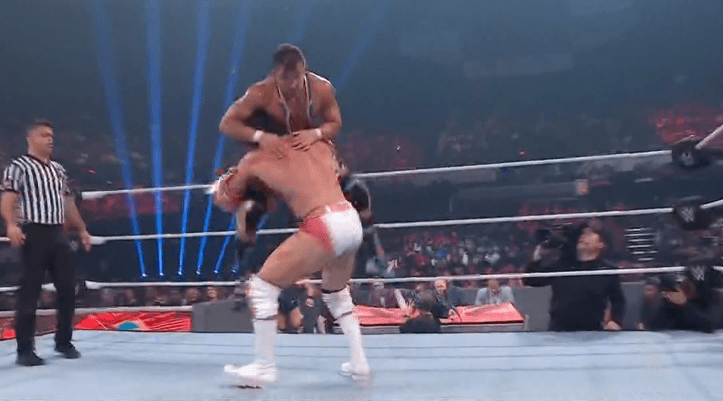 查德上绳飞扑,遭以西结一记空中铁膝盖,双肩压地被弹开