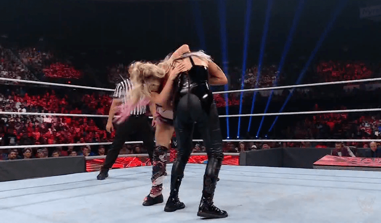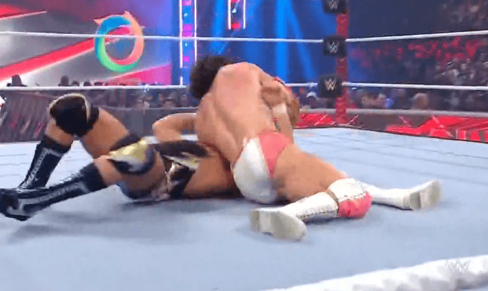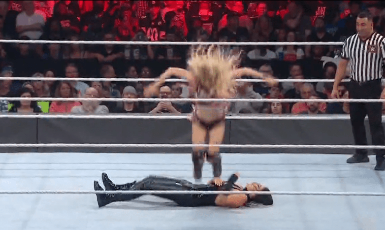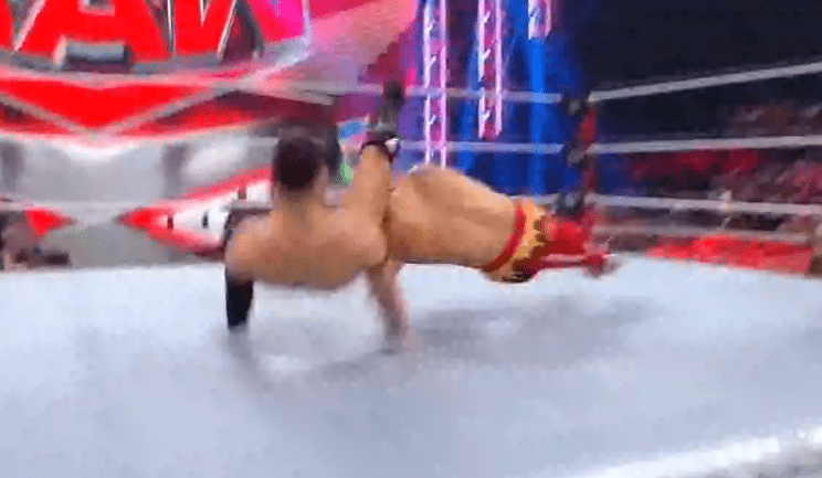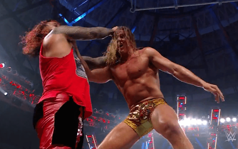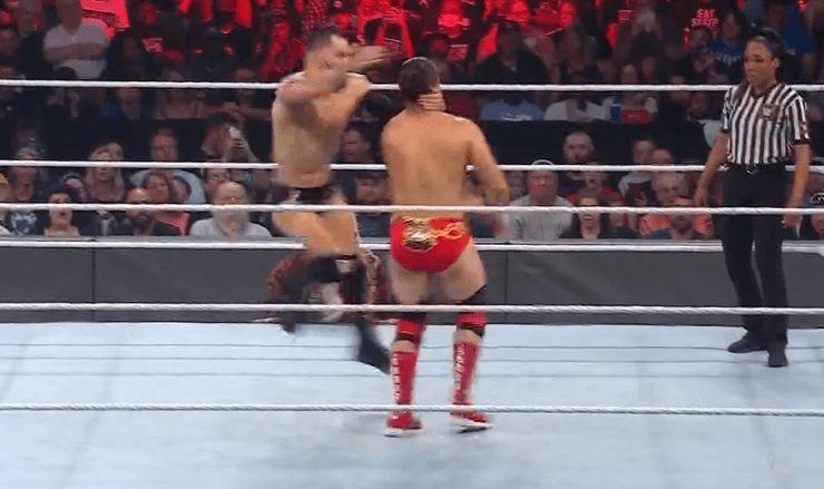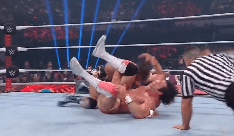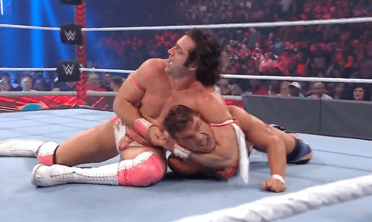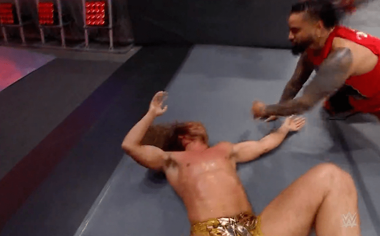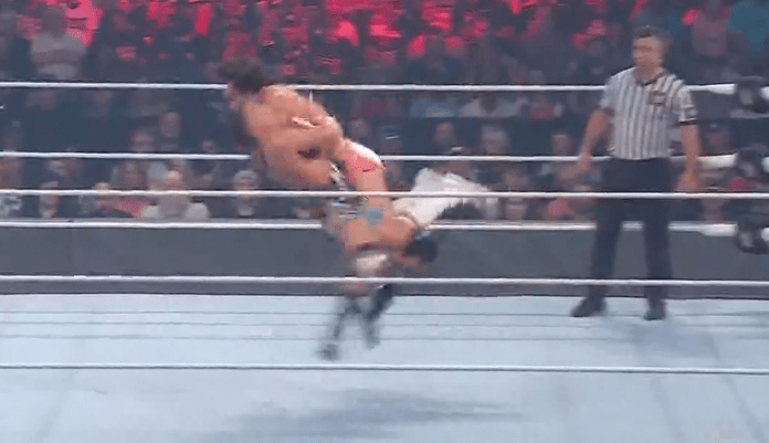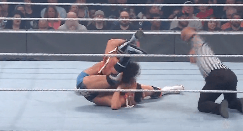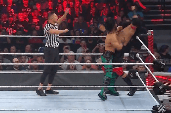 查德上绳飞扑,遭以西结一记空中铁膝盖,双肩压地被弹开