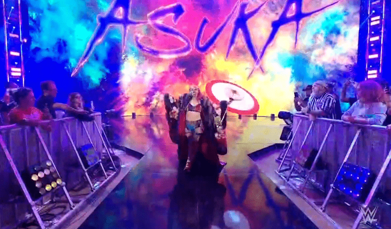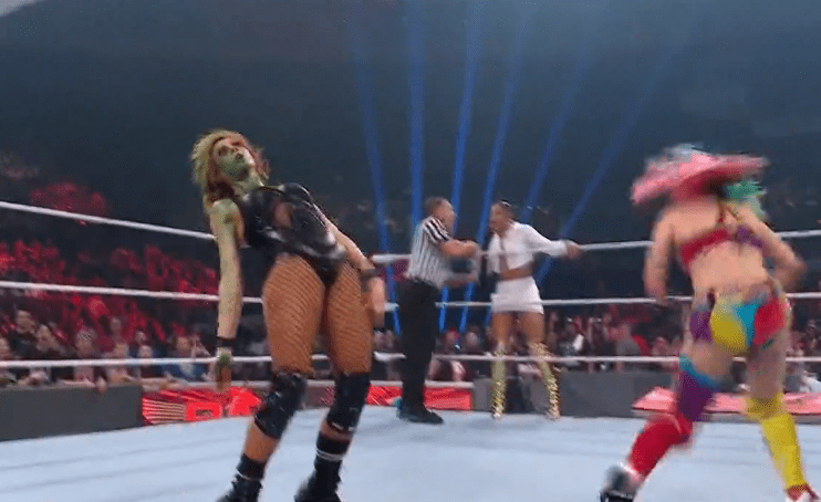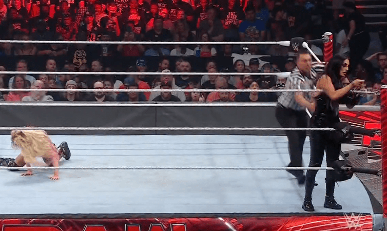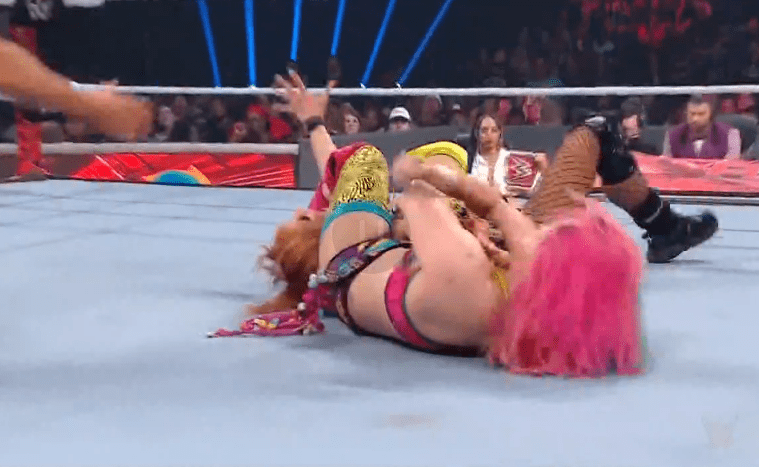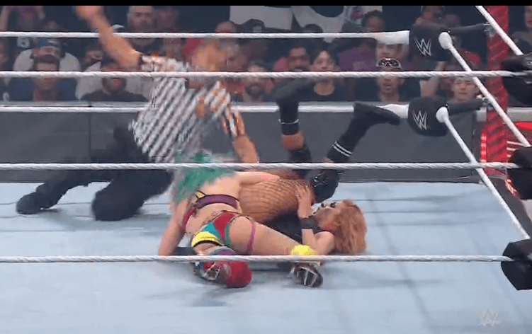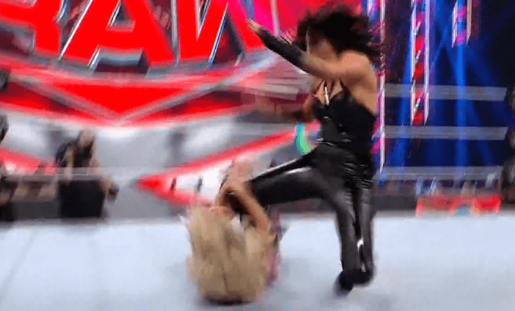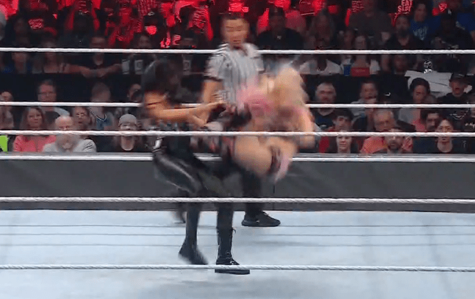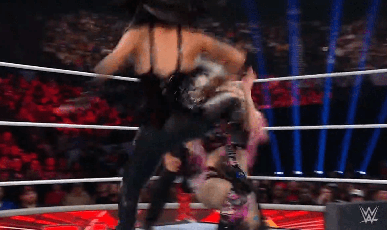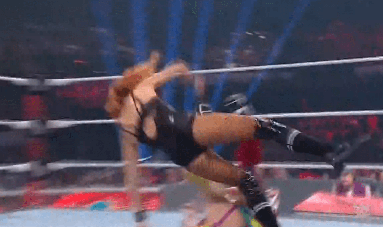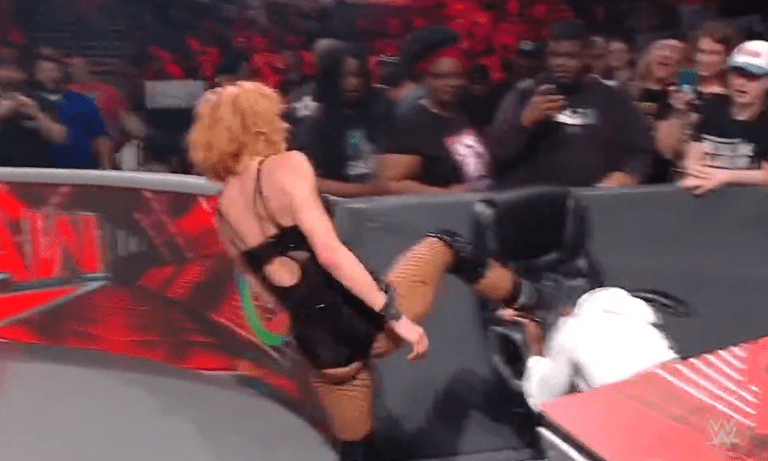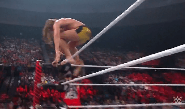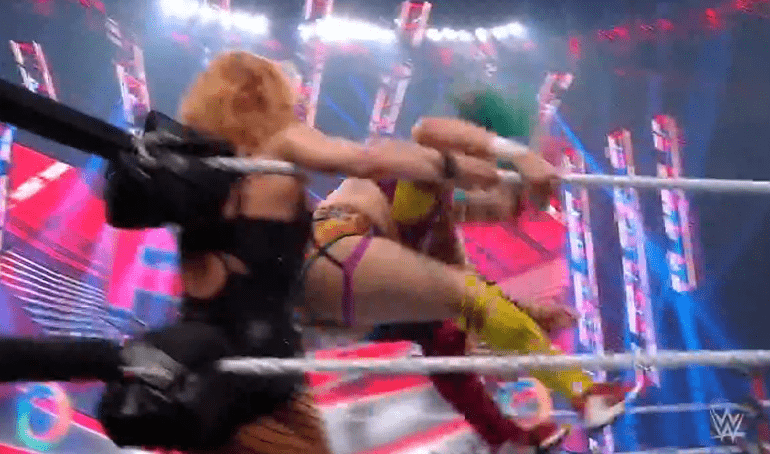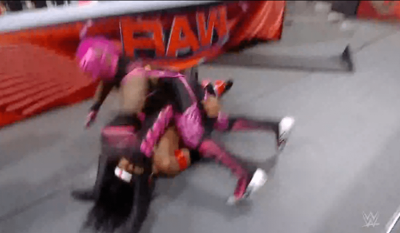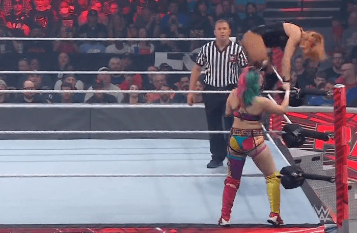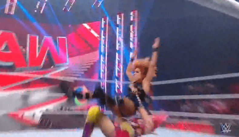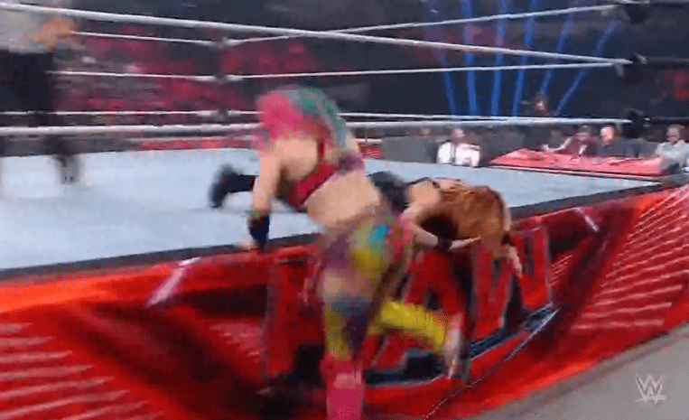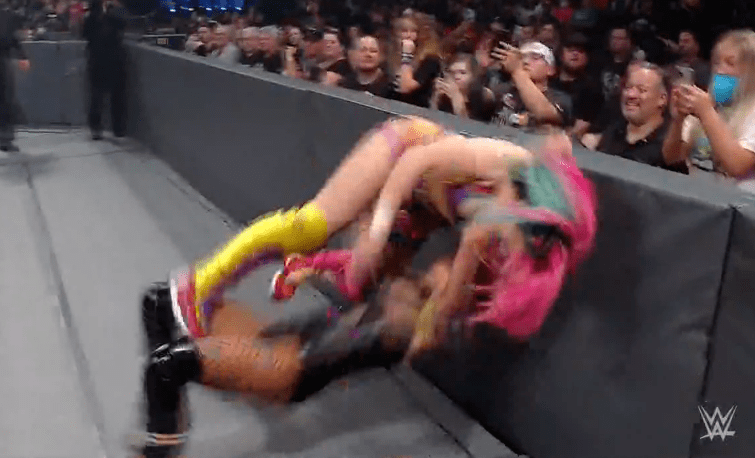 贝基一个背摔将明日华摔在围栏上,不得动弹
