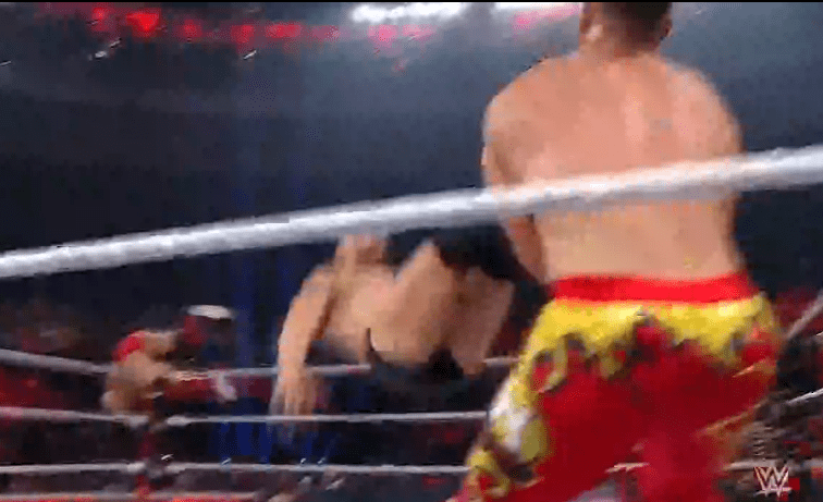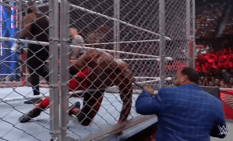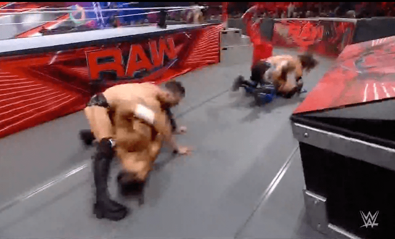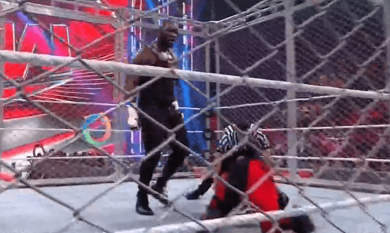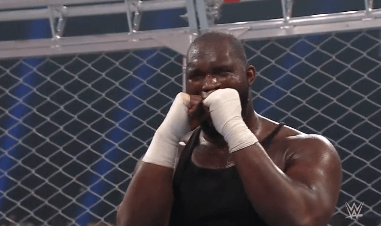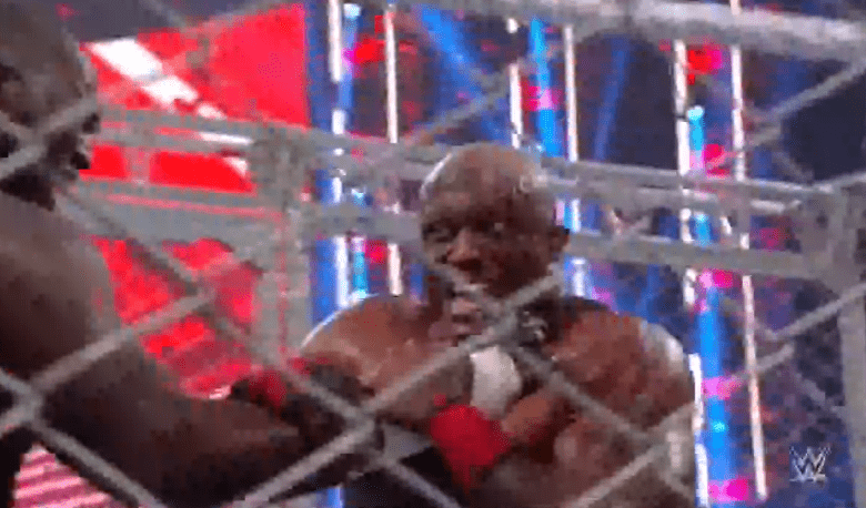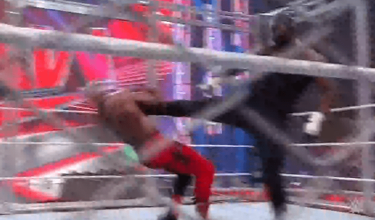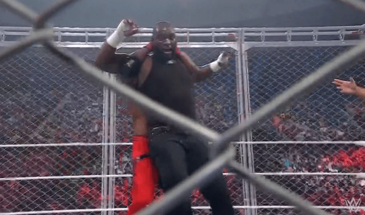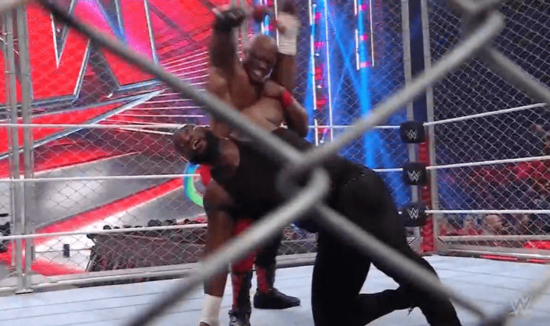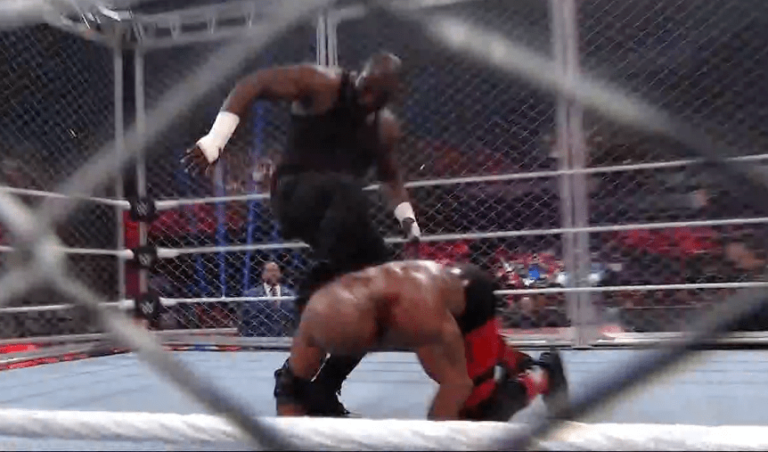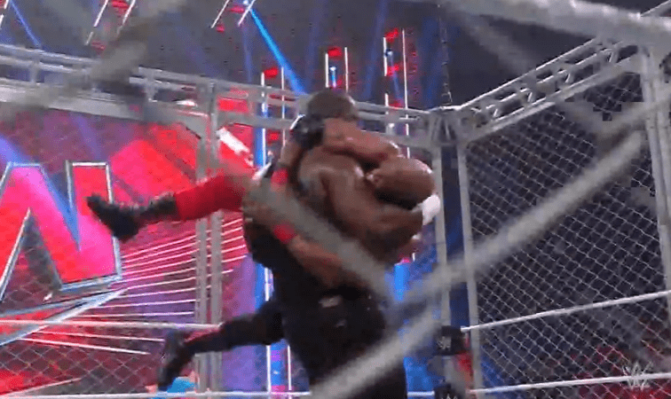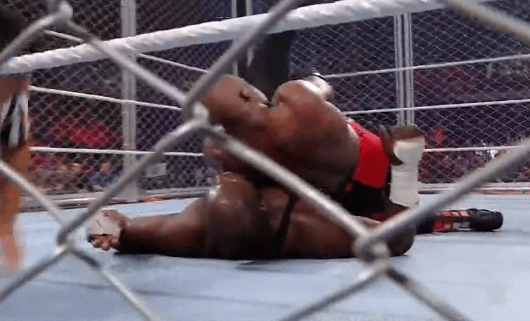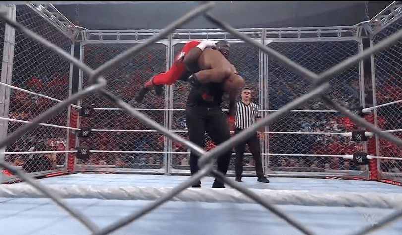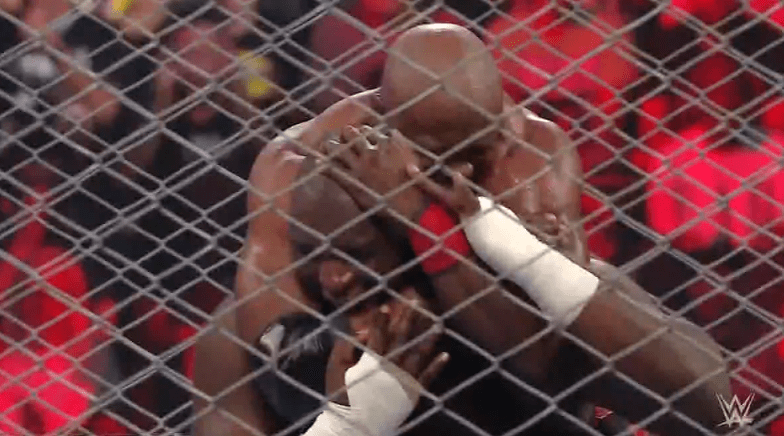 鲍比飞扑,被奥莫斯抱住 ,将其扔向铁笼
