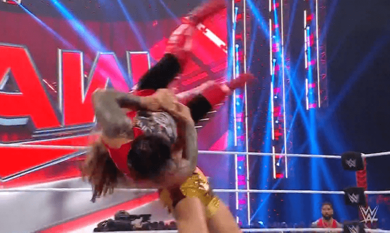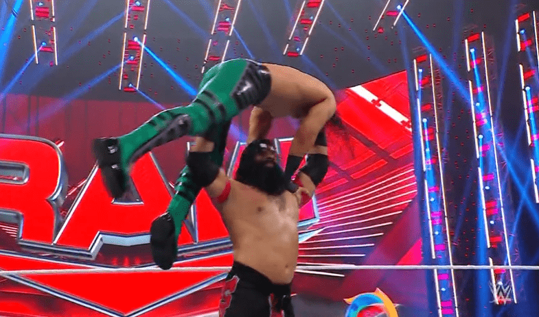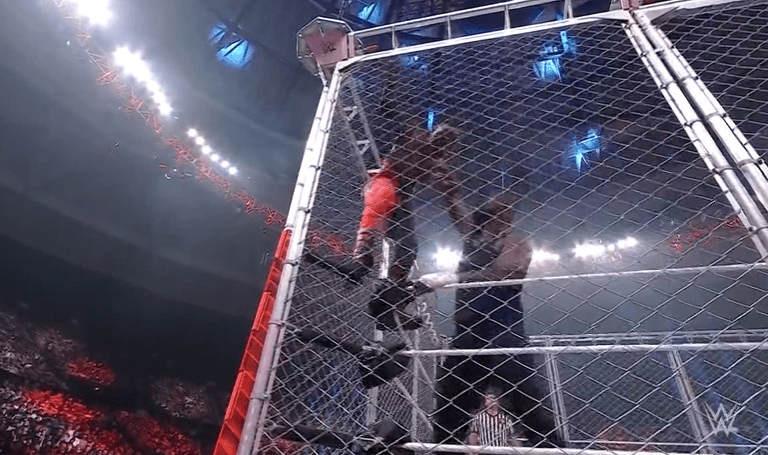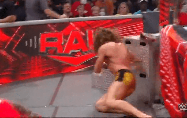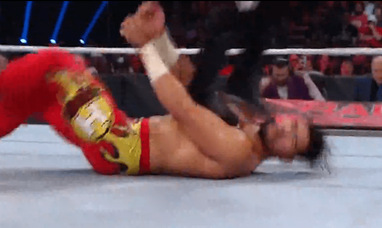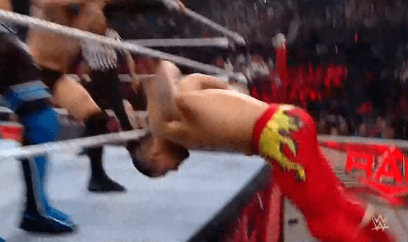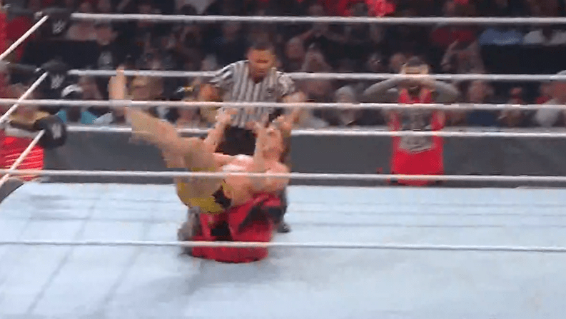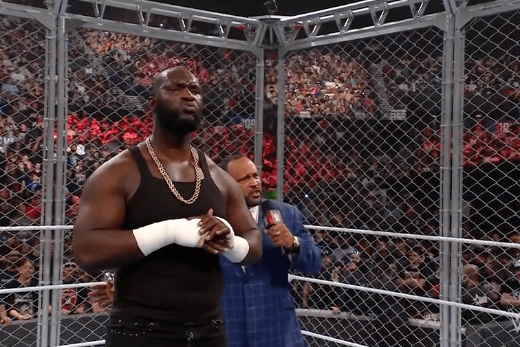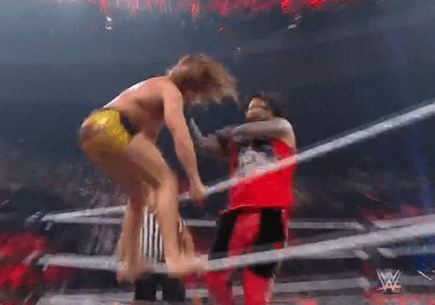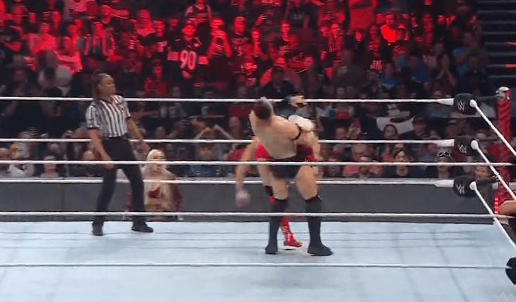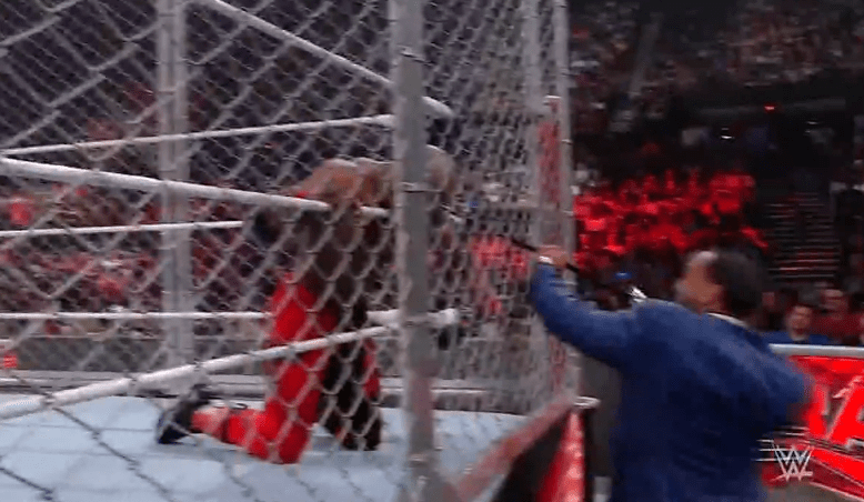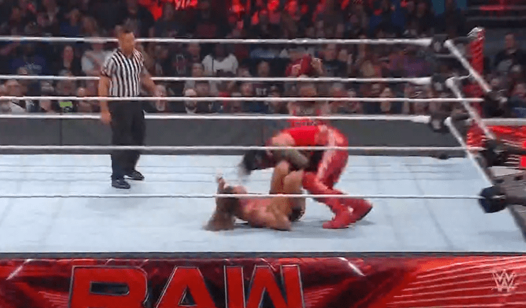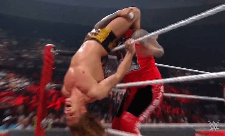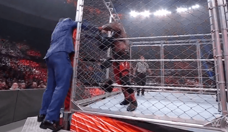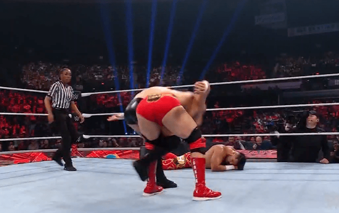 鲍比飞扑,被奥莫斯抱住 ,将其扔向铁笼