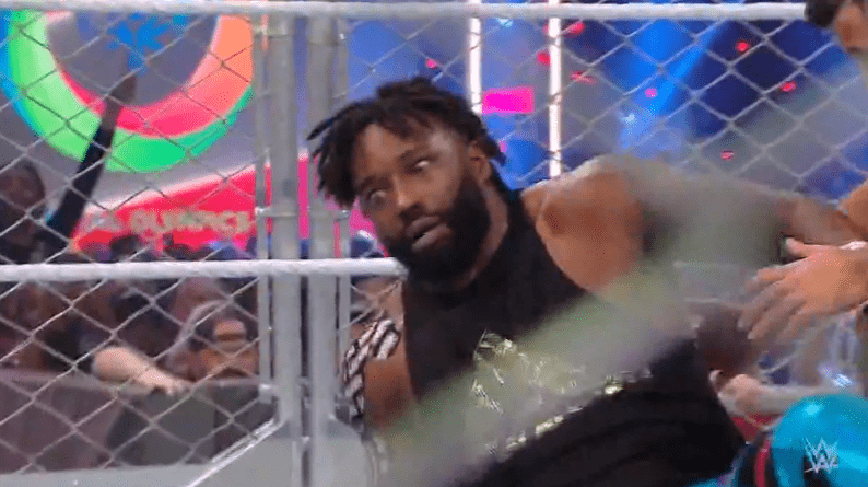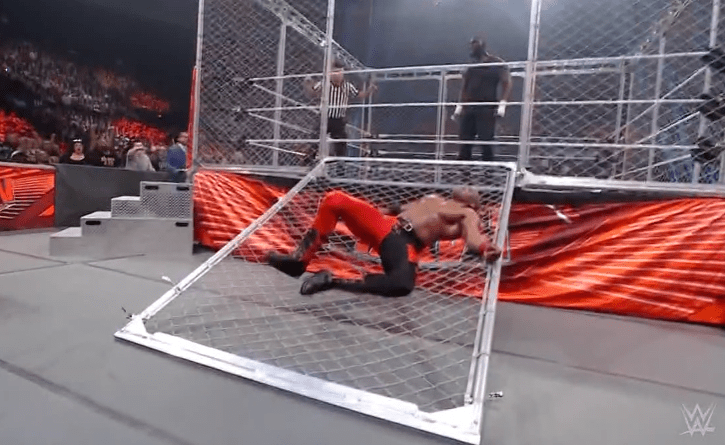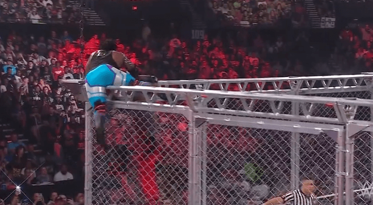 获胜者:鲍比莱斯利 不论是怎样进来的,谁先双脚着地,走出牢笼就算胜利!!奥莫斯一脸懵!!都想哭了哈哈