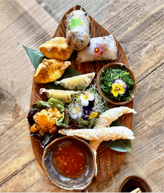 餐厅菜单不长,但是菜品不拘一格,既有汉堡、披萨,西班牙火腿等比较西式的菜肴,还有亚洲风味的面条、春卷、饺子等,连盘子上都配有招财猫!喜欢美食和美景的你,总能找到你爱的那一款。