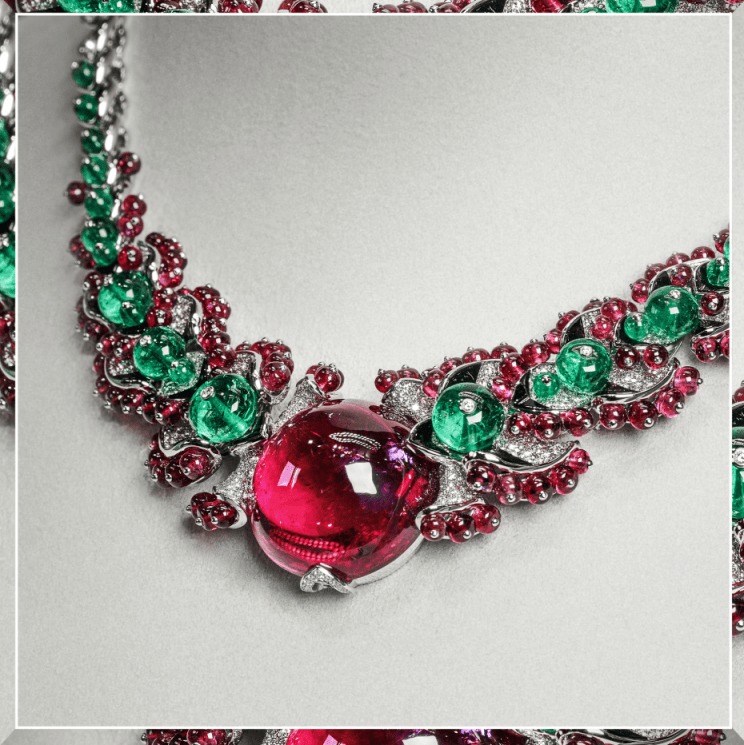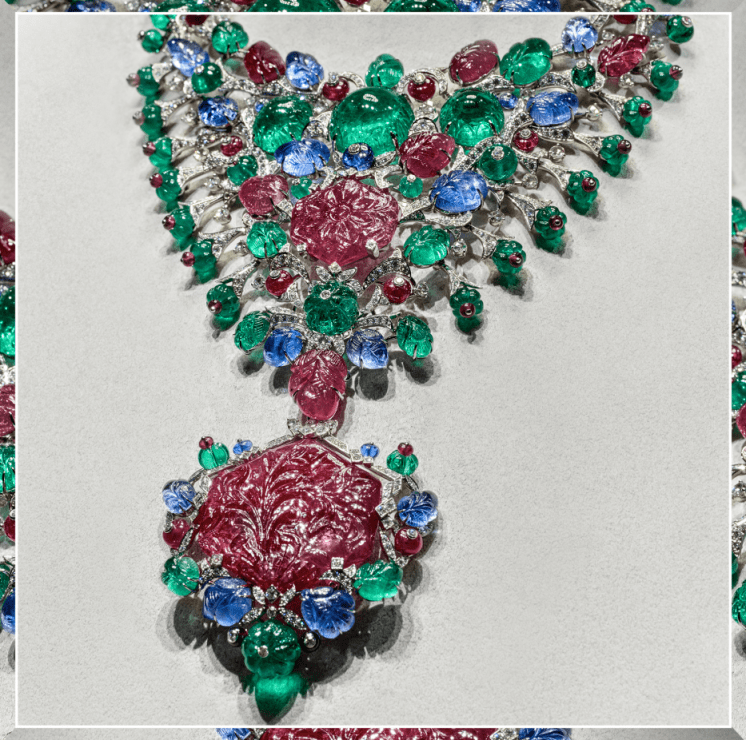 全新SIXIME SENS PAR CARTIER高级珠宝系列UDYANA项链 UDYANA项链,花园颂赞: 这条项链再度持续卡地亚标记性的Tutti Frutti水果锦囊作风,不同外形和尺寸的雕琢蓝宝石、红宝石和祖母绿在蜷曲的铂金枝叶上生长蔓延,勾勒出一首奄奄一息的花园颂歌。圆润丰满的浆果、深邃的中央花簇,一切皆挑动感官,交错芬芳香气或甜美滋味。多种佩戴方式亦充溢惊喜:坠饰可拆下搭配长细链,主项链可单独佩戴,连结卡扣的图案部分可作胸针。