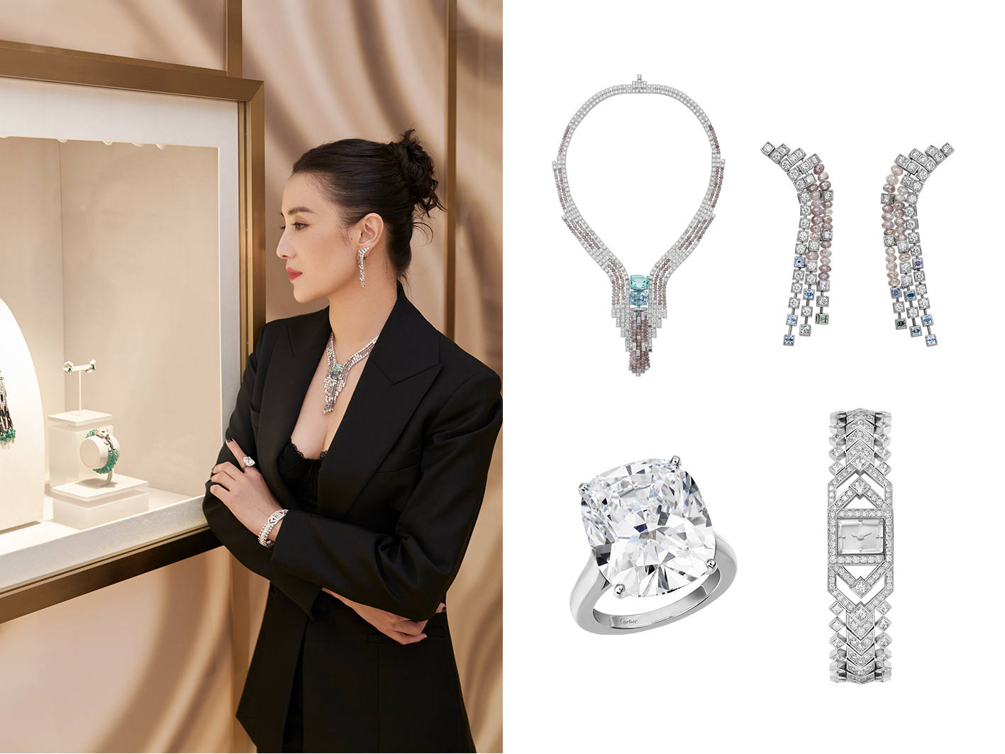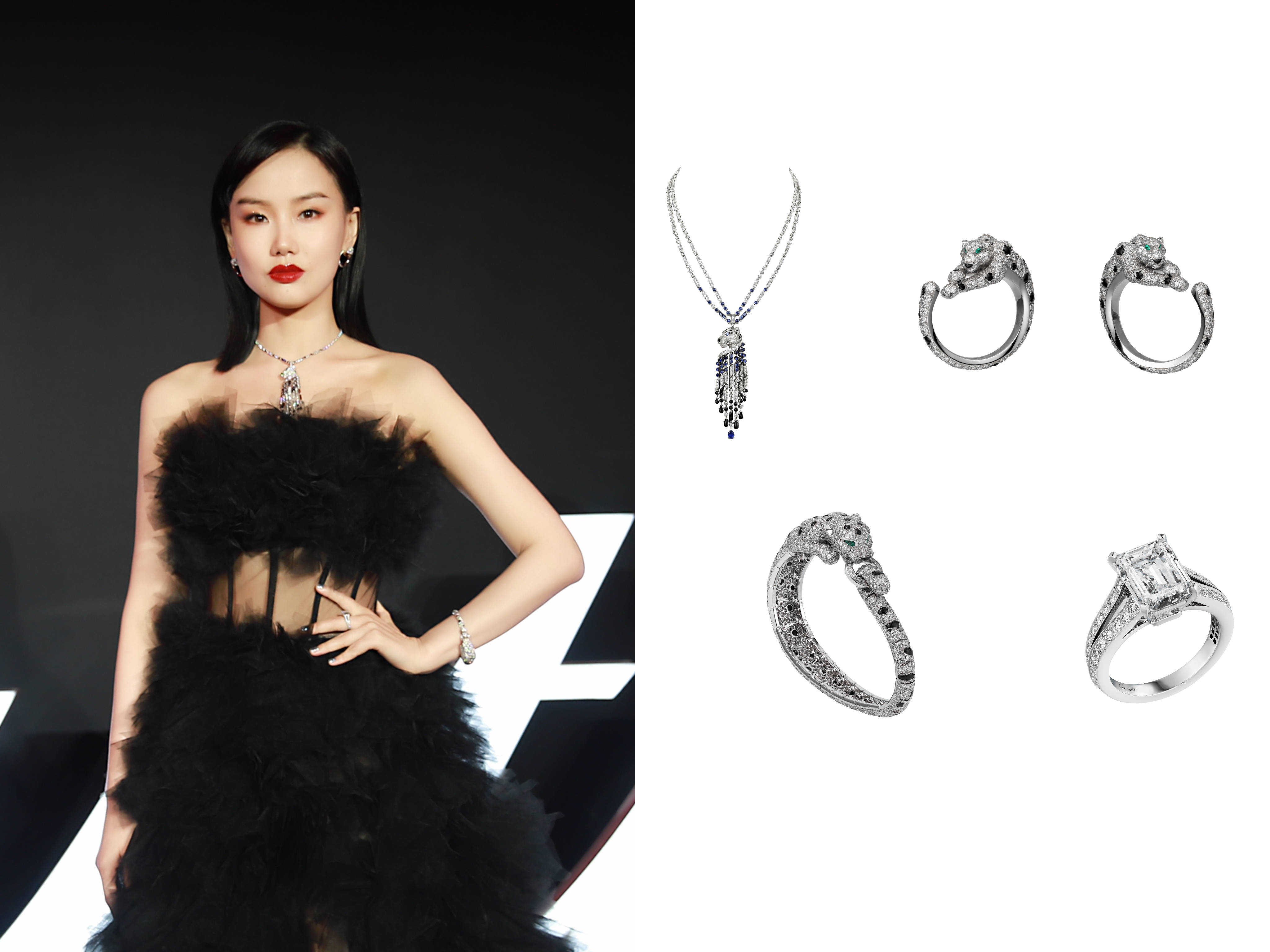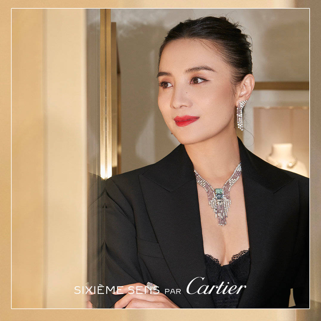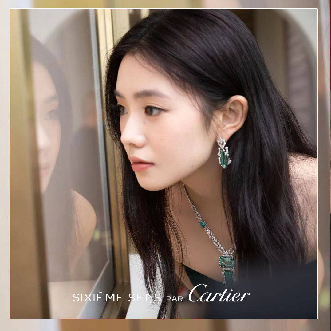 知名演员宋佳列席卡地亚全新Sixième Sens Par Cartier高级珠宝展览,佩戴Sixième Sens Par Cartier高级珠宝系列Perito项链、耳环、卡地亚高级珠宝系列戒指及腕表。