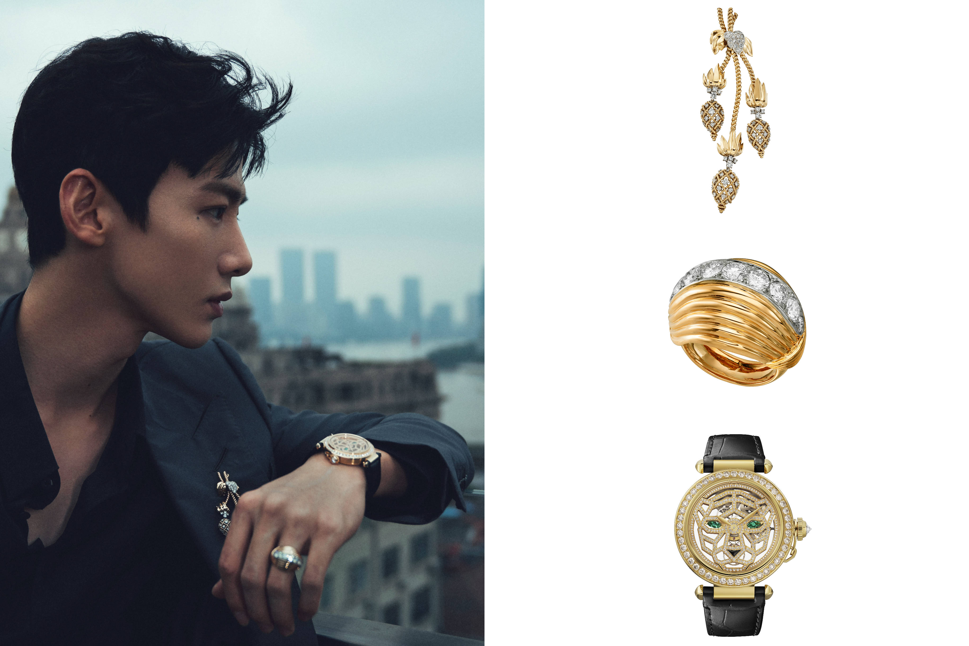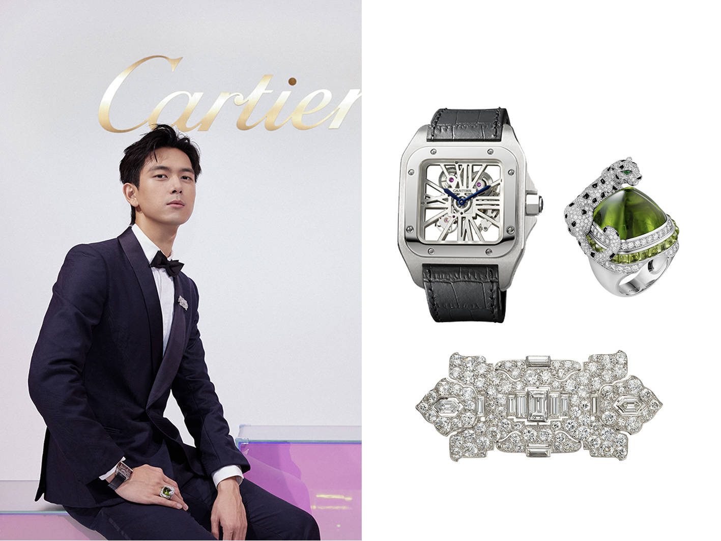 列席全新Sixième Sens Par Cartier高级珠宝展览的卡地亚品牌挚友李现,佩戴卡地亚古董珍藏系列胸针、Santos de Cartier卡地亚山度士镂空腕表及Panthère de Cartier卡地亚猎豹系列高级珠宝戒指。