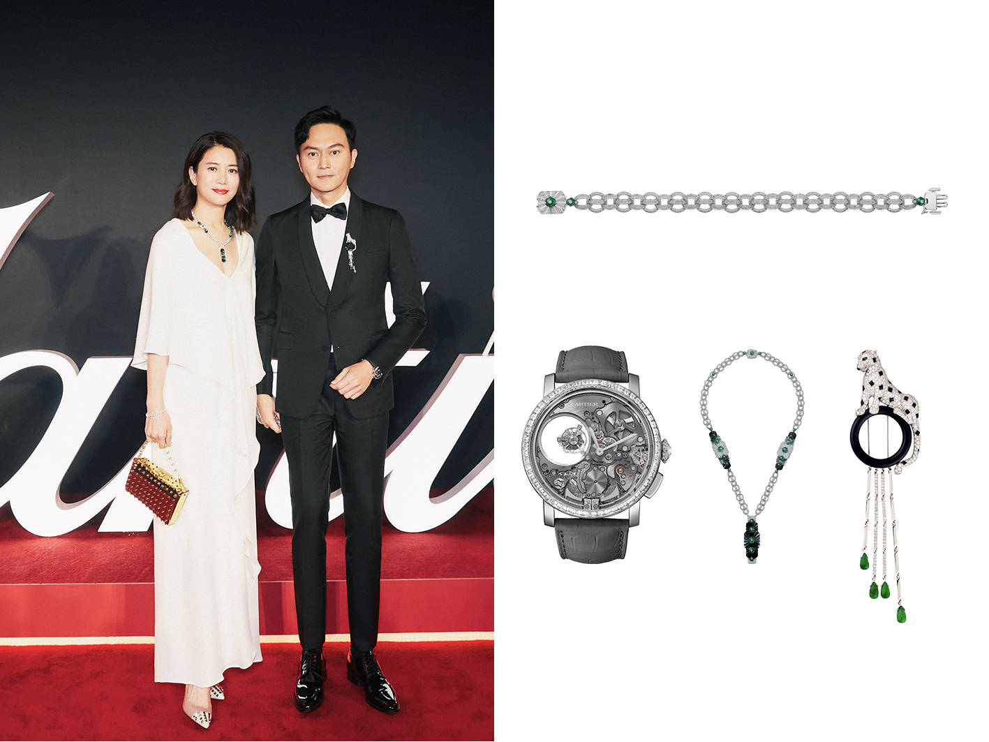 张智霖佩戴卡地亚古董珍藏系列胸针、卡地亚Tank Cintrée系列腕表及卡地亚高级珠宝系列戒指。 知名演员宋佳