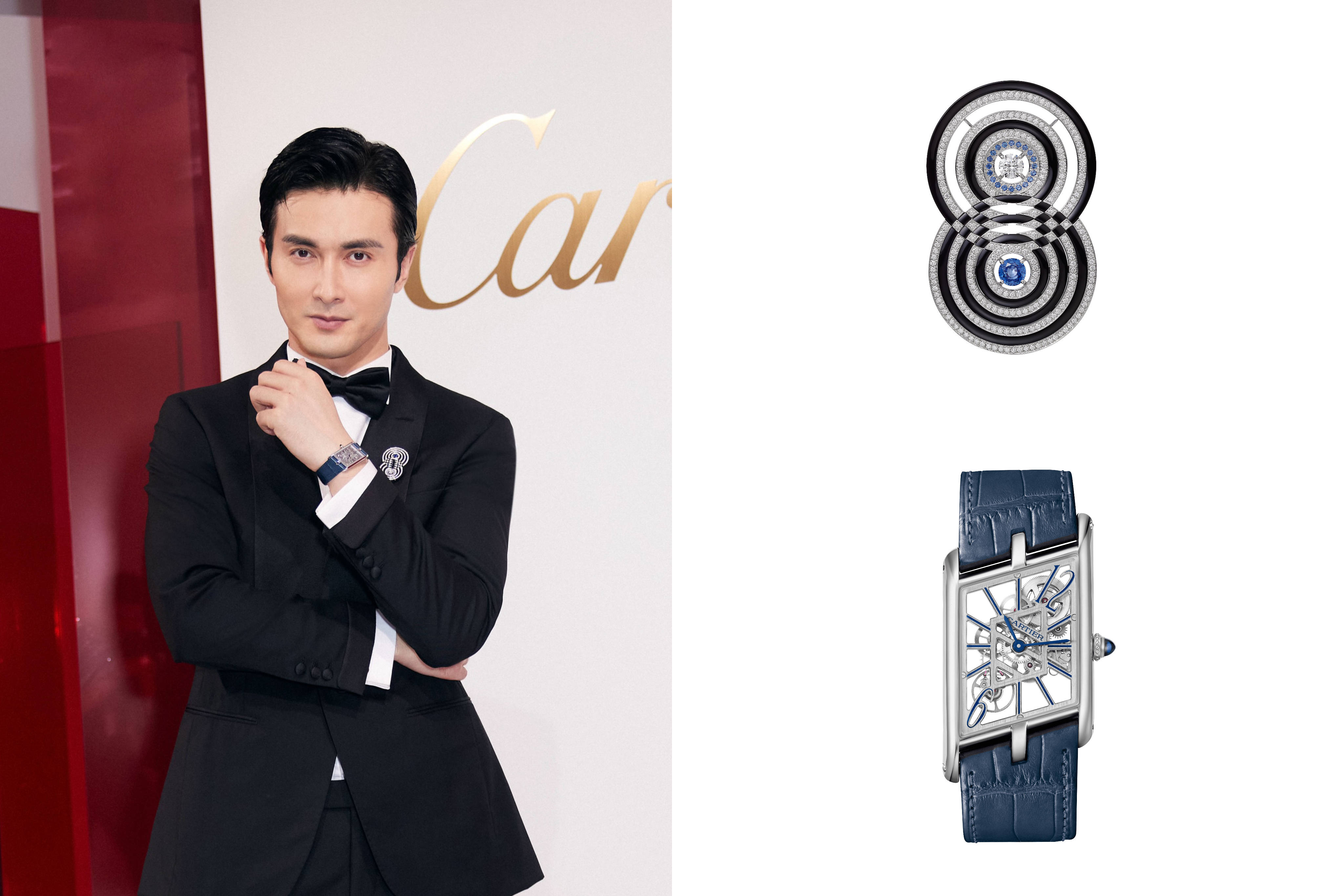 列席卡地亚全新Sixième Sens Par Cartier高级珠宝展览,高伟光了佩戴卡地亚高级珠宝系列胸针、卡地亚Tank Asymétrique系列镂空腕表。 知名演员白敬亭