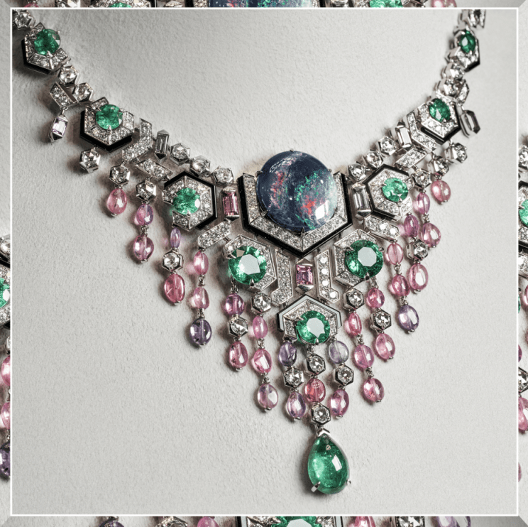全新SIXIME SENS PAR CARTIER高级珠宝系列EVASION项链 EVASION项链,邂逅宇宙梦境: 醒目的黑色欧泊分发变幻颜色,犹如一颗闪烁行星,层叠展开的宝石排列就像以笼统形态呈现的繁星,又如划过夜空的流星雨,绚丽耀眼。