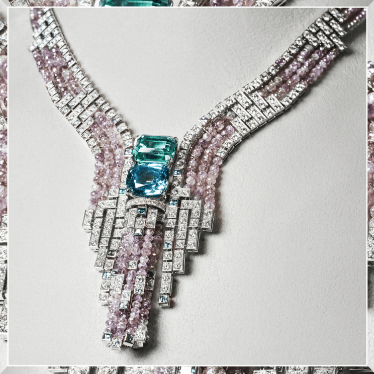 全新SIXIME SENS PAR CARTIER高级珠宝系列PERITO项链 PERITO项链,连绵不绝的瀑布: 得名于阿根廷巴塔哥尼亚地域的冰川瀑布,这条项链用马赛克拼接工艺将不同切割的白色钻石、粉色钻石、碧玺和蓝宝石组合,每颗宝石各自捕获和反射着光线,营造纷至沓来的现象,激起内心丰沛感受。