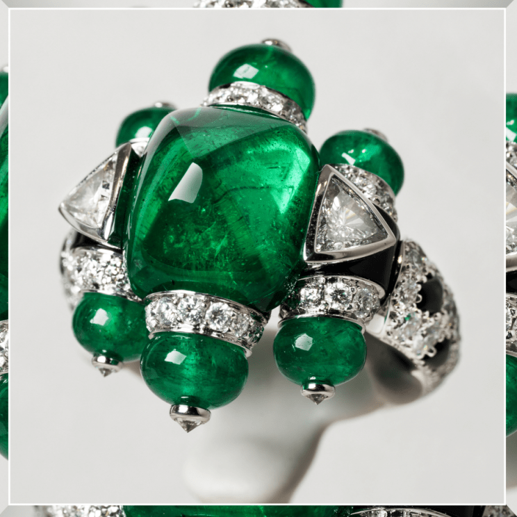 全新SIXIME SENS PAR CARTIER高级珠宝系列PANTHERE MILLARDI戒指 PANTHERE MILLARD戒指,以未知引导想象: 猎豹皮毛的斑纹图案藏匿在戒指的设计当中,糖包山切割祖母绿主石成为注目的亮点,卡地亚经典作品中的圆珠切割祖母绿作为烘托,打造出富有层次的平面感。装饰艺术作风黑、绿颜色组合是戒指设计的另一亮点,又一次演绎出品牌作风传承下让人眼前一亮的创意。