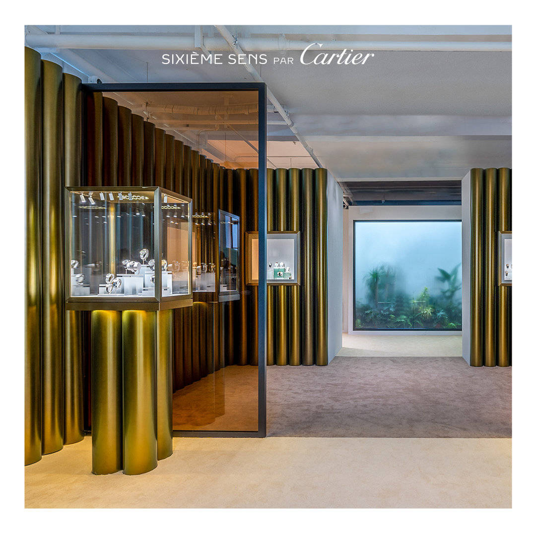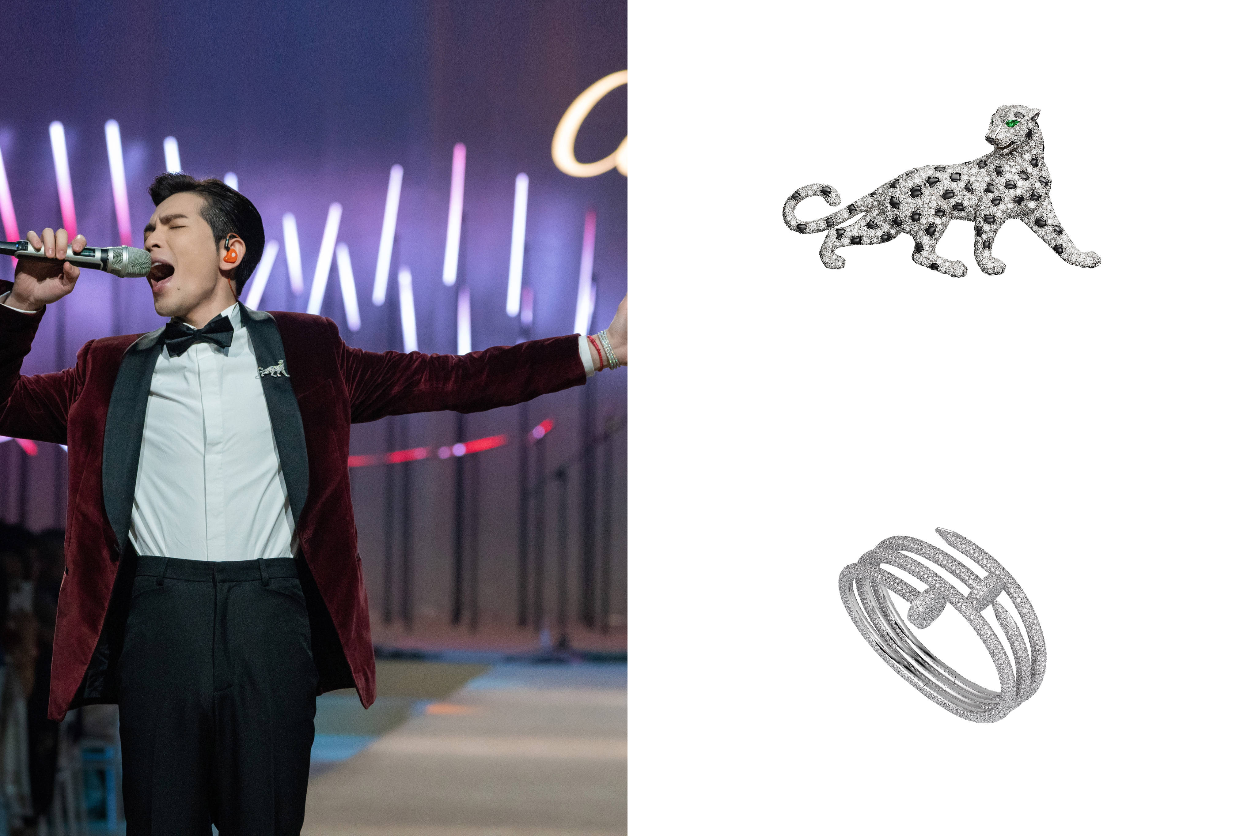 萧敬腾佩戴了Panthere de Cartier卡地亚猎豹系列高级珠宝胸针及卡地亚Juste un Clou系列手镯参与演出。 感官之旅:探秘SIXIME SENS PAR CARTIER高级珠宝展