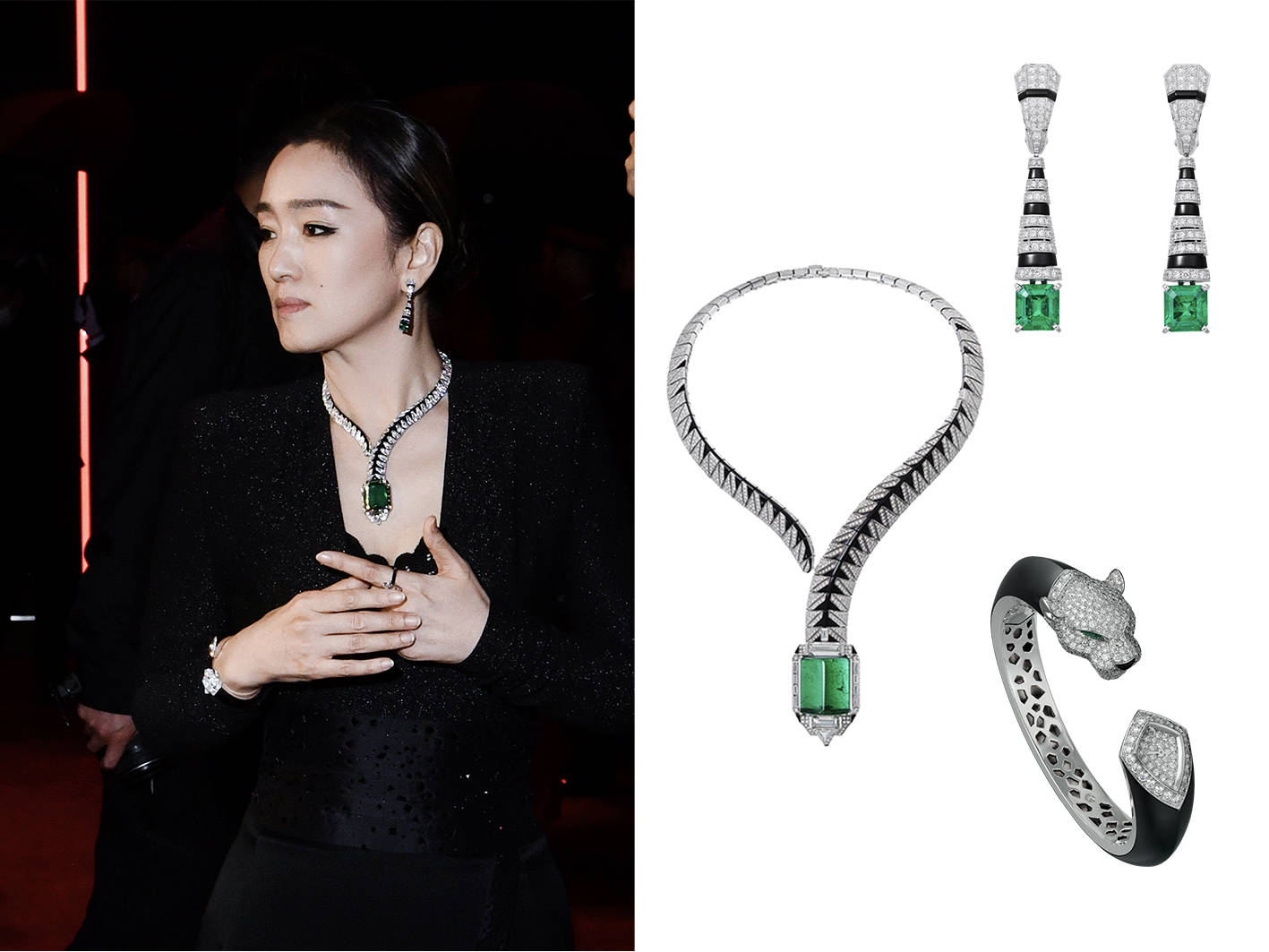 而在列席全新Sixième Sens Par Cartier高级珠宝展晚宴时,巩俐则佩戴了卡地亚[Sur]Naturel高级珠宝系列项链、卡地亚高级珠宝系列耳环及卡地亚La Panthère猎豹外型珠宝腕表。