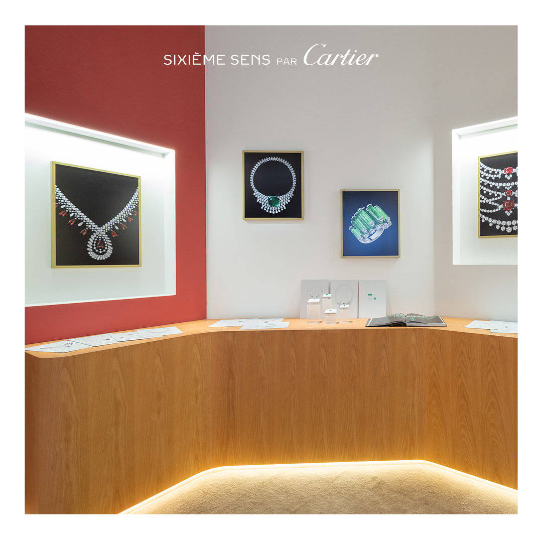 卡地亚品牌挚友刘浩存列席全新Sixième Sens Par Cartier高级珠宝展览,佩戴Sixième Sens Par Cartier高级珠宝系列Synapse耳环、项链、卡地亚高级珠宝系列戒指及腕表。