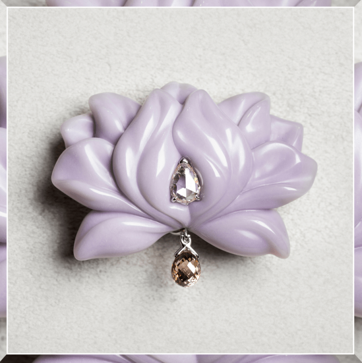 NELUMBO胸针,生命的蓬勃生发: 经过Glyptics宝石雕琢工艺,栩栩如生的莲花由紫色玛瑙雕琢而成,重现花瓣的柔嫩质感和丰盈丰满的姿势。装点花瓣上的梨形钻石,似乎一颗正欲滴落的晨露,与悬于底部的水滴形钻石晶莹呼应。