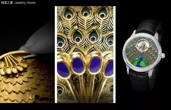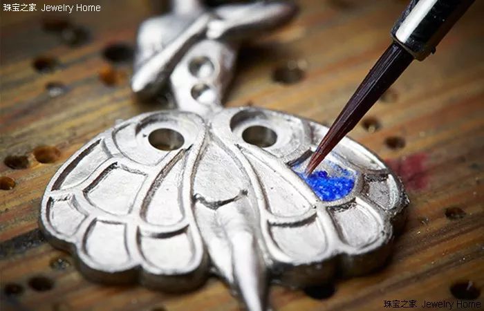 Van Cleef & Arpels 梵克雅宝 内填珐琅细节图 內填珐琅的制造流程其实和掐丝珐琅相似,不同之处在于掐丝珐琅是以铜线框出外形,而内填珐琅则是在金属底板上雕琢、腐蚀等措施让底板产生能够填釉的凹处,然后再将珐琅涂料填入进去,所以用在腕表上比较多。