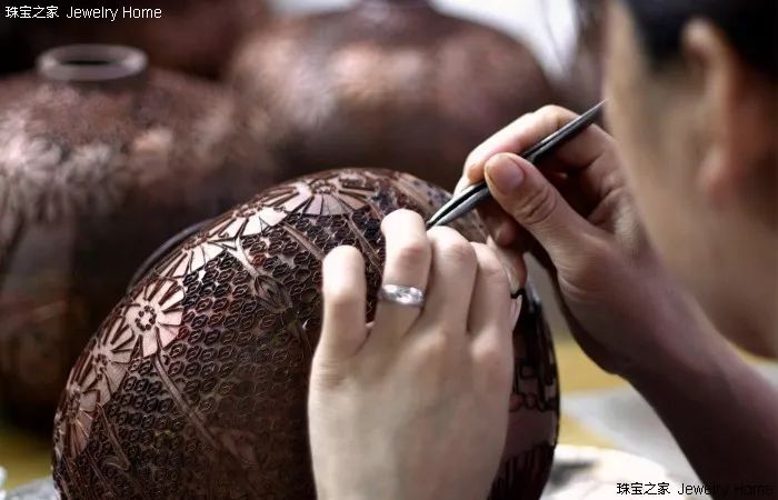 Van Cleef & Arpels 梵克雅宝 内填珐琅工艺图 制造难点: 內填珐琅普通运用的是透明珐琅涂料,因而雕琢的凹槽底座也成为了装饰的一部分,图案上有了更大的发挥空间。雕琢技师要有熟练的阅历,才干知道纹路的深度和宽度如何拿捏、让轮廓更明晰、填釉之后的成果更平面。 透珐琅